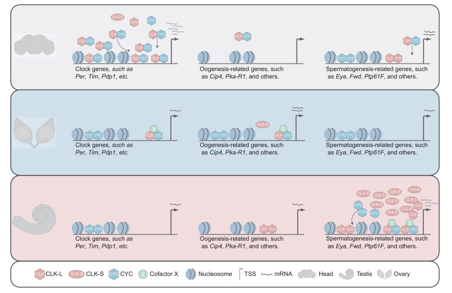 生物钟是生物体内一种内在的计时机制,协调着生理和行为以适应昼夜变化。然而,核心时钟元件在外周组织(如生殖器官)中如何被调整以执行组织特异性功能有待研究。该研究团队首先发现果蝇Clk存在长异构体(Clk-L)和短异构体(Clk-S),二者在生殖组织中表达模式具有明显差异。Clk-S在睾丸中高度富集,而Clk-L在头部和肠道中表达较高,卵巢中两者表达均较低。这种异构体的组织特异性分布是调节生殖组织昼夜节律环路的关键。
